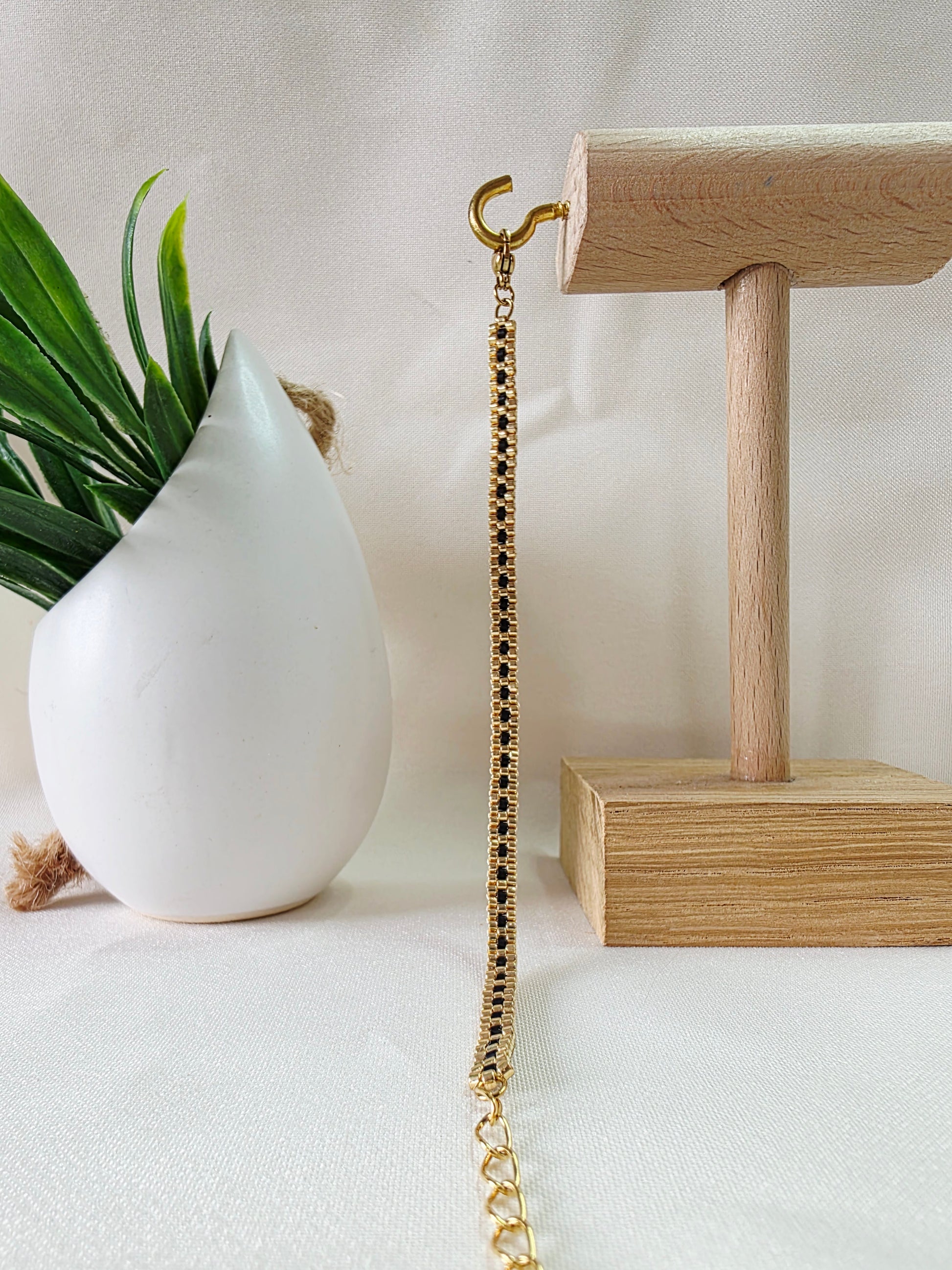 - Dimensions : Largeur d'environ 4 mm. Longueur de tissage de 14 cm env. Chaînette réglable de 5 cm permettant une longueur totale adaptable à toutes les tailles de poignet.