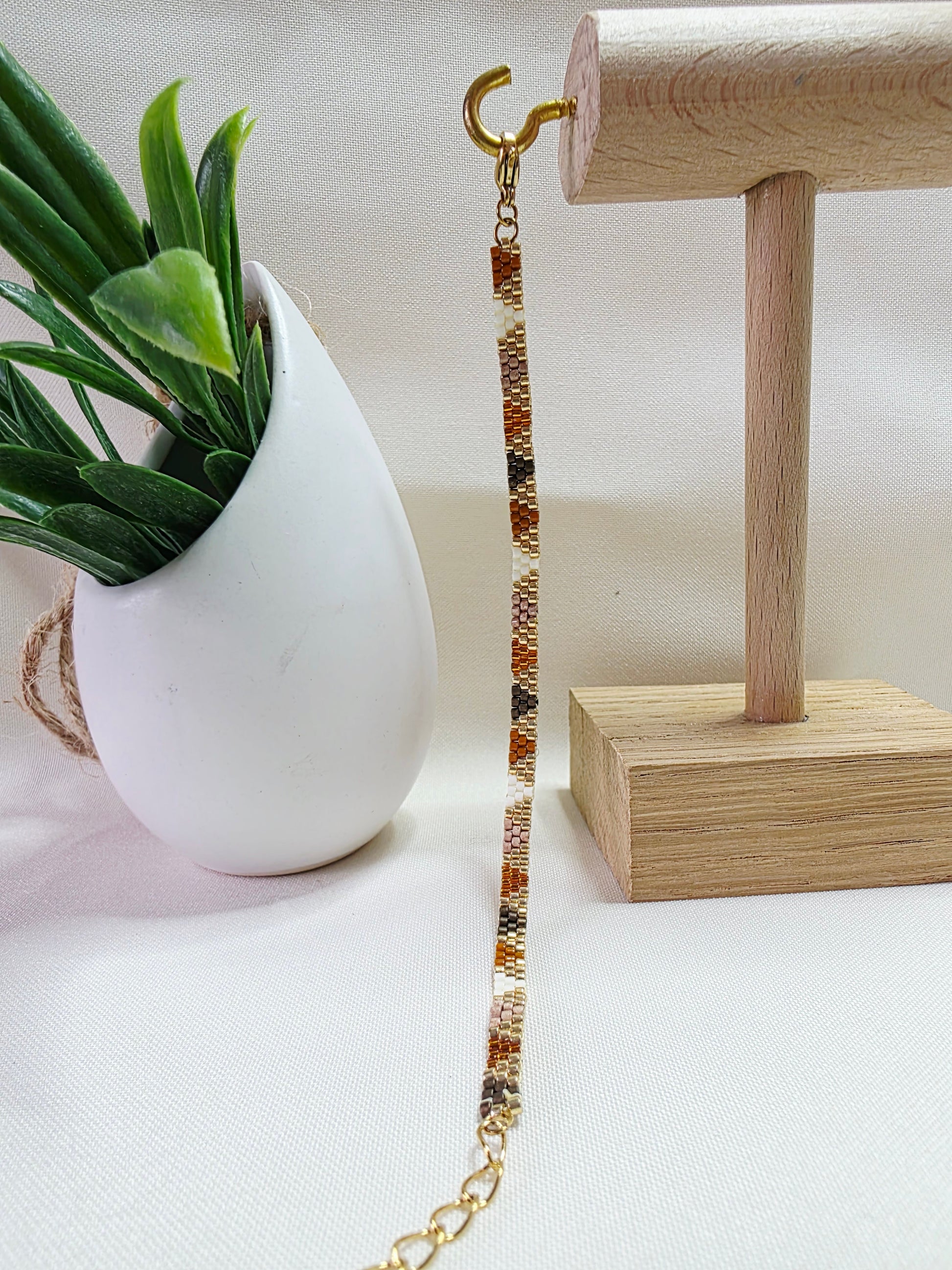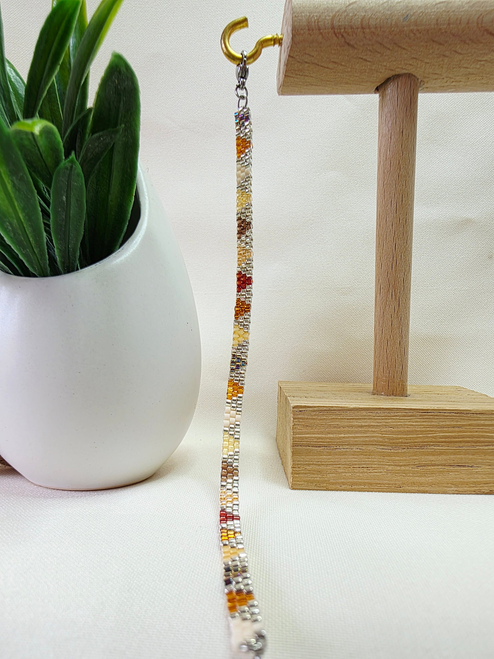 Chaque bracelet est tissé à l'aiguille, perle après perle, avec patience et passion. Il peut arriver que quelques nuances de couleurs varient selon l'inspiration du moment ou la disponibilité des perles. Rassurez-vous : le modèle reçu reste toujours fidèle à l'esprit de celui présenté — avec ce petit supplément d'âme propre au fait-main.