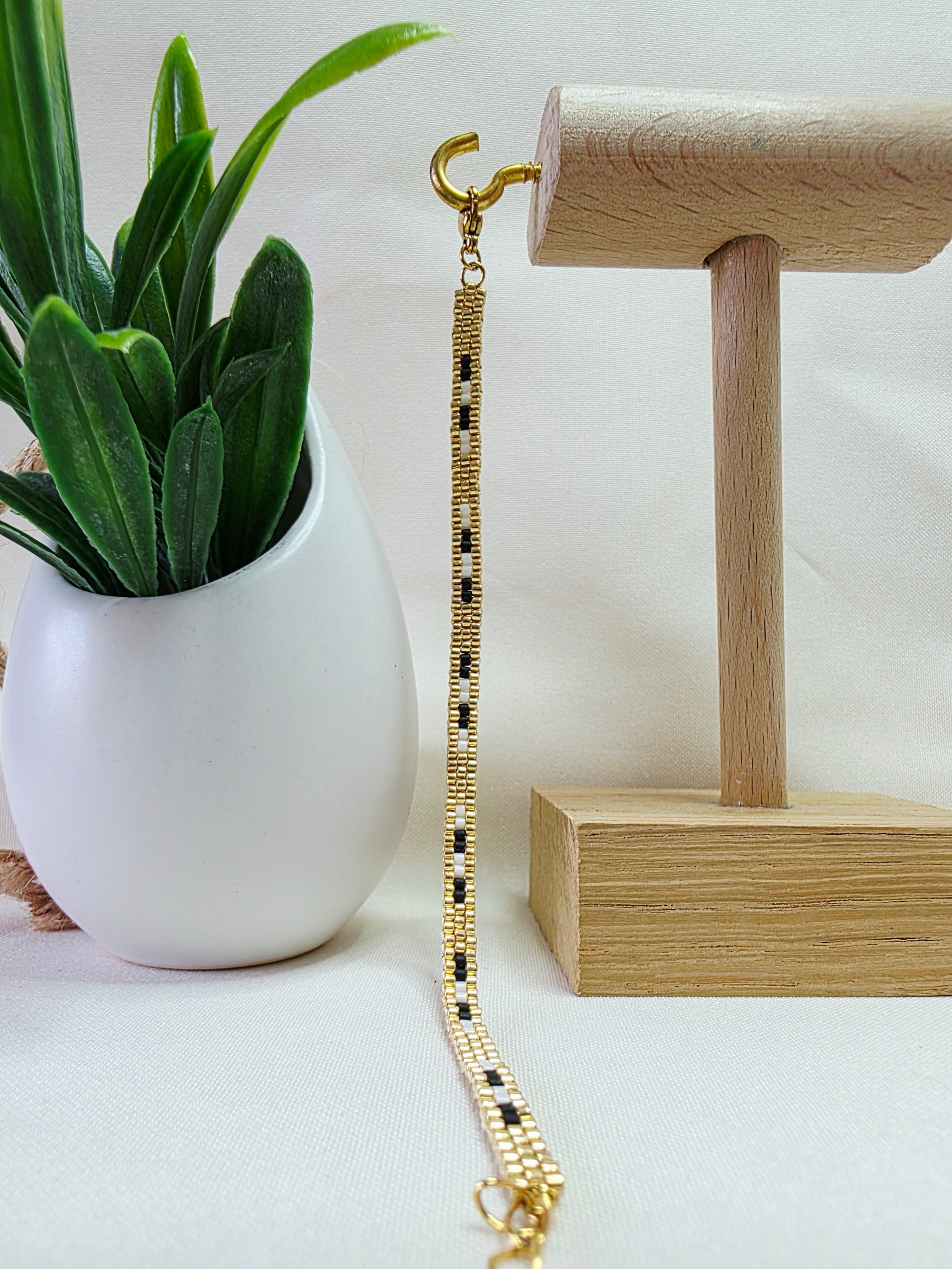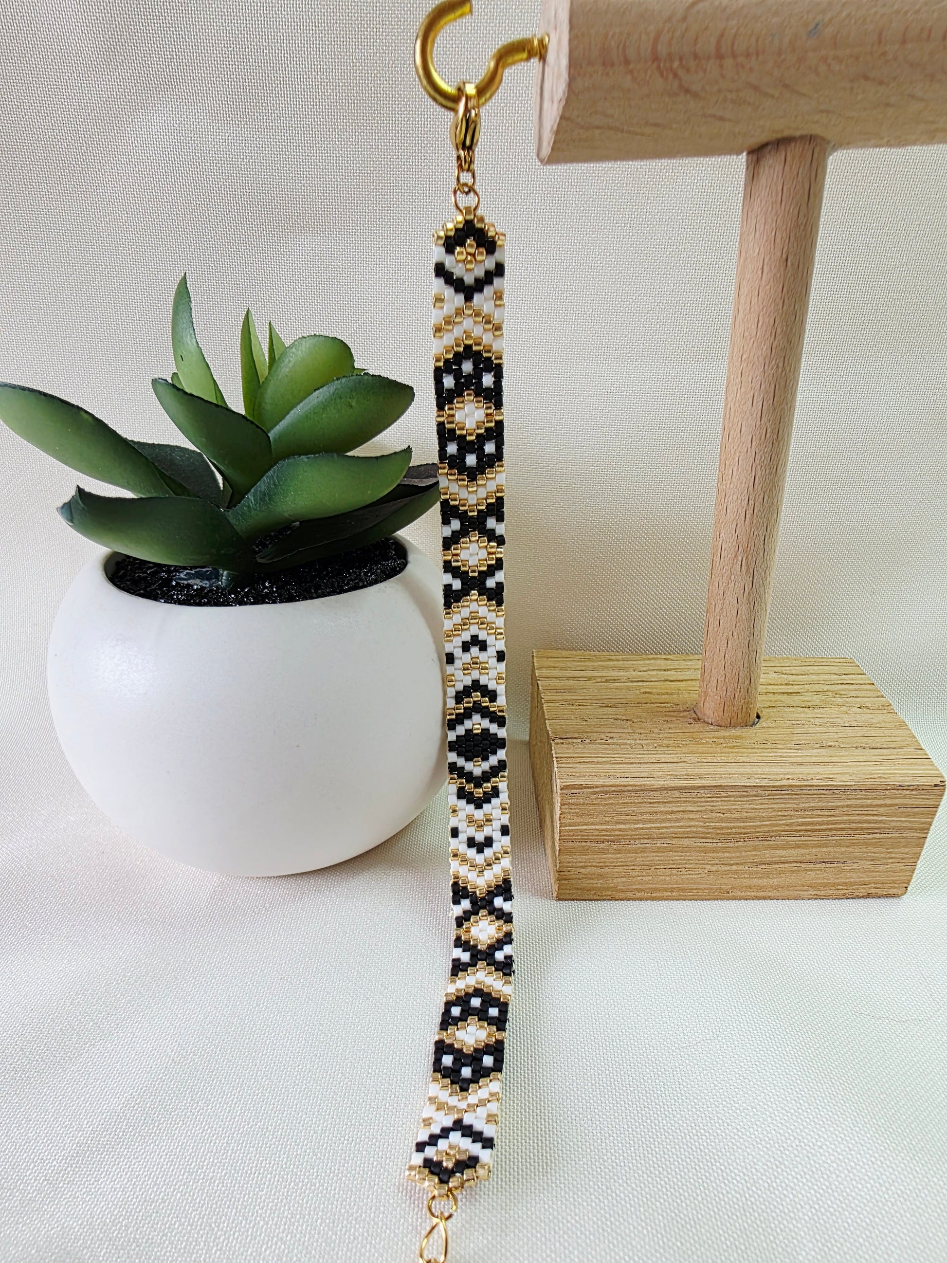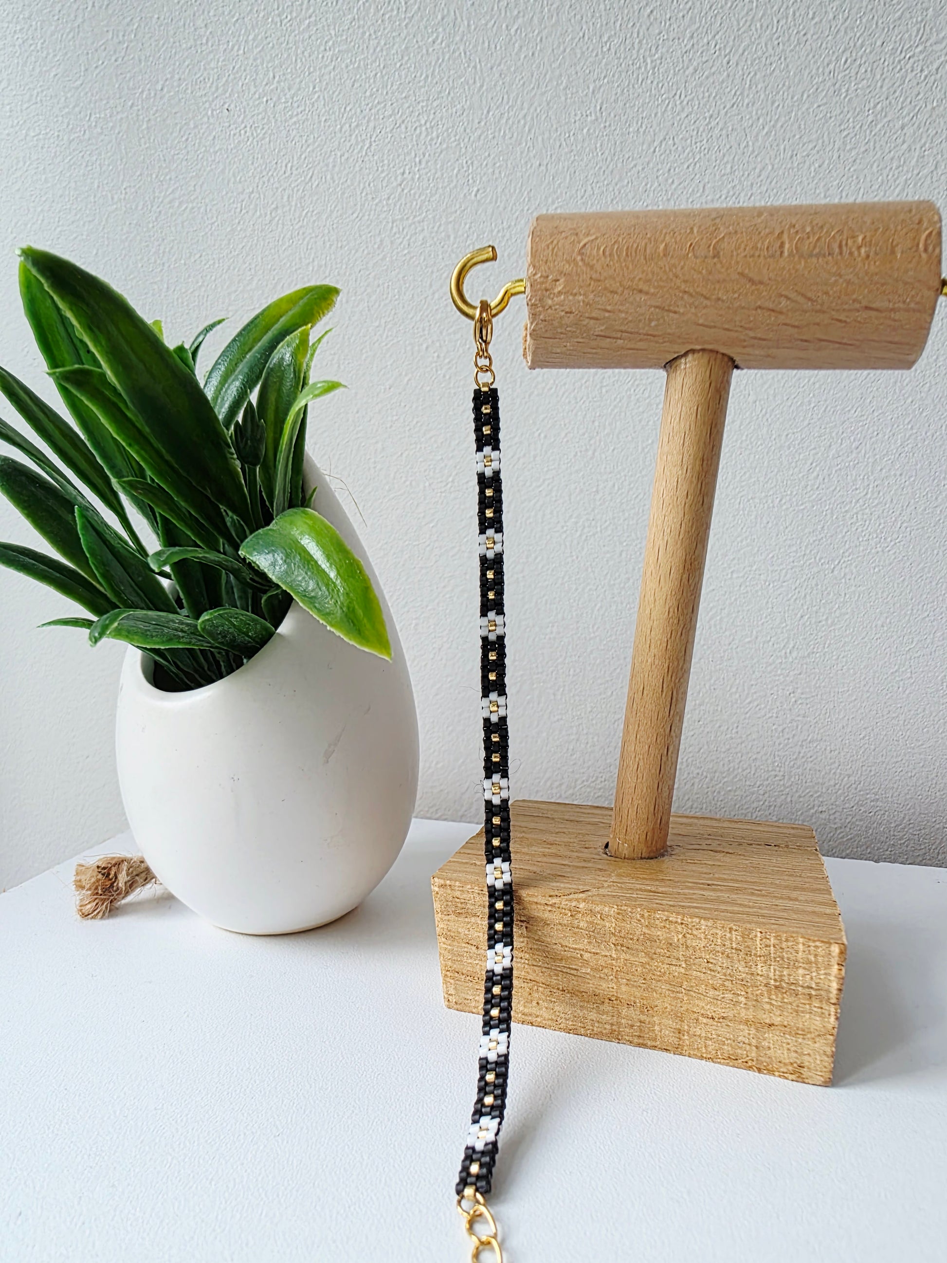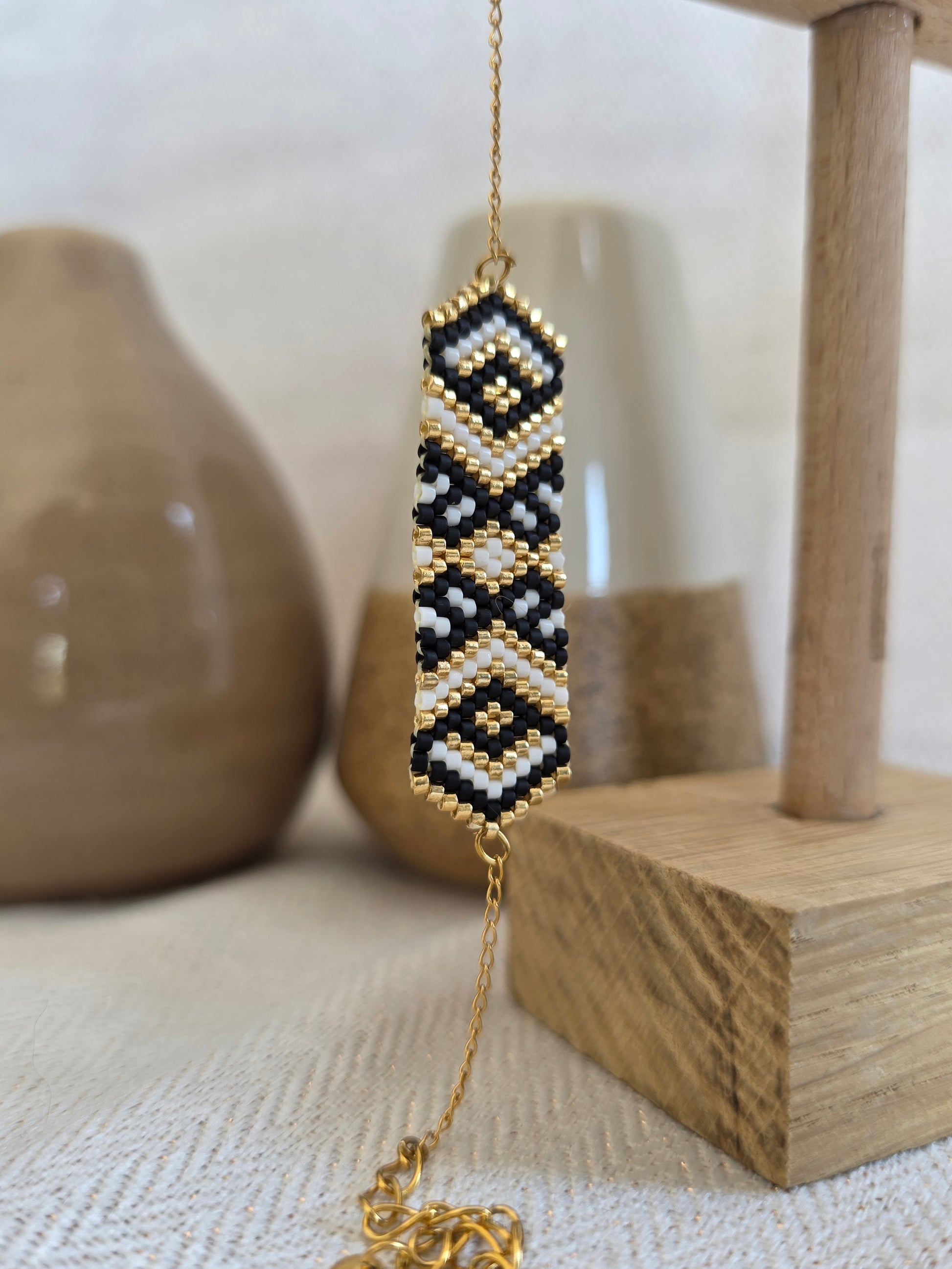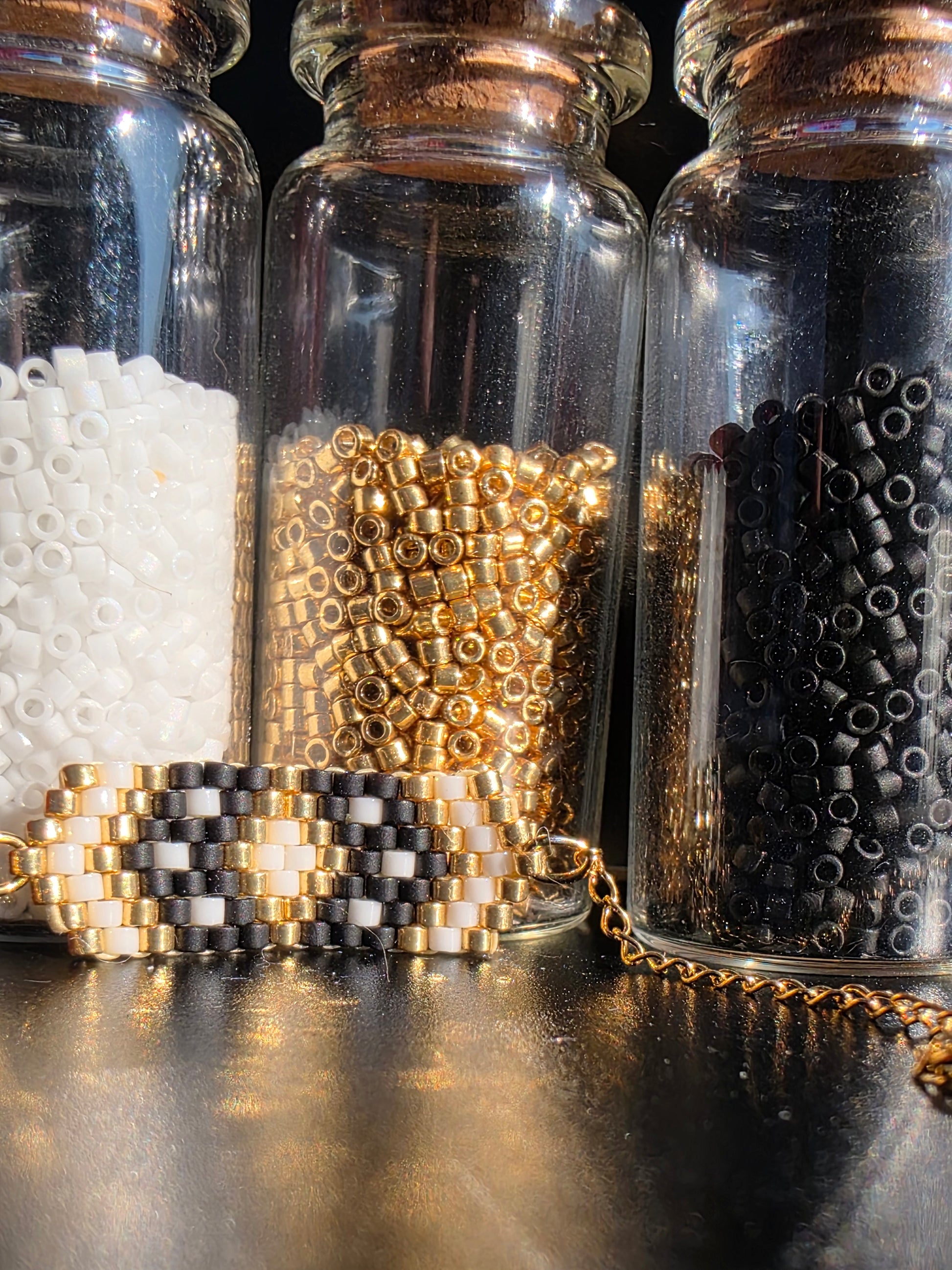 J’assemble chaque perle Miyuki Delica une à une pour créer un motif géométrique équilibré, où le doré vient illuminer les nuances mates et satinées du noir et du blanc.
