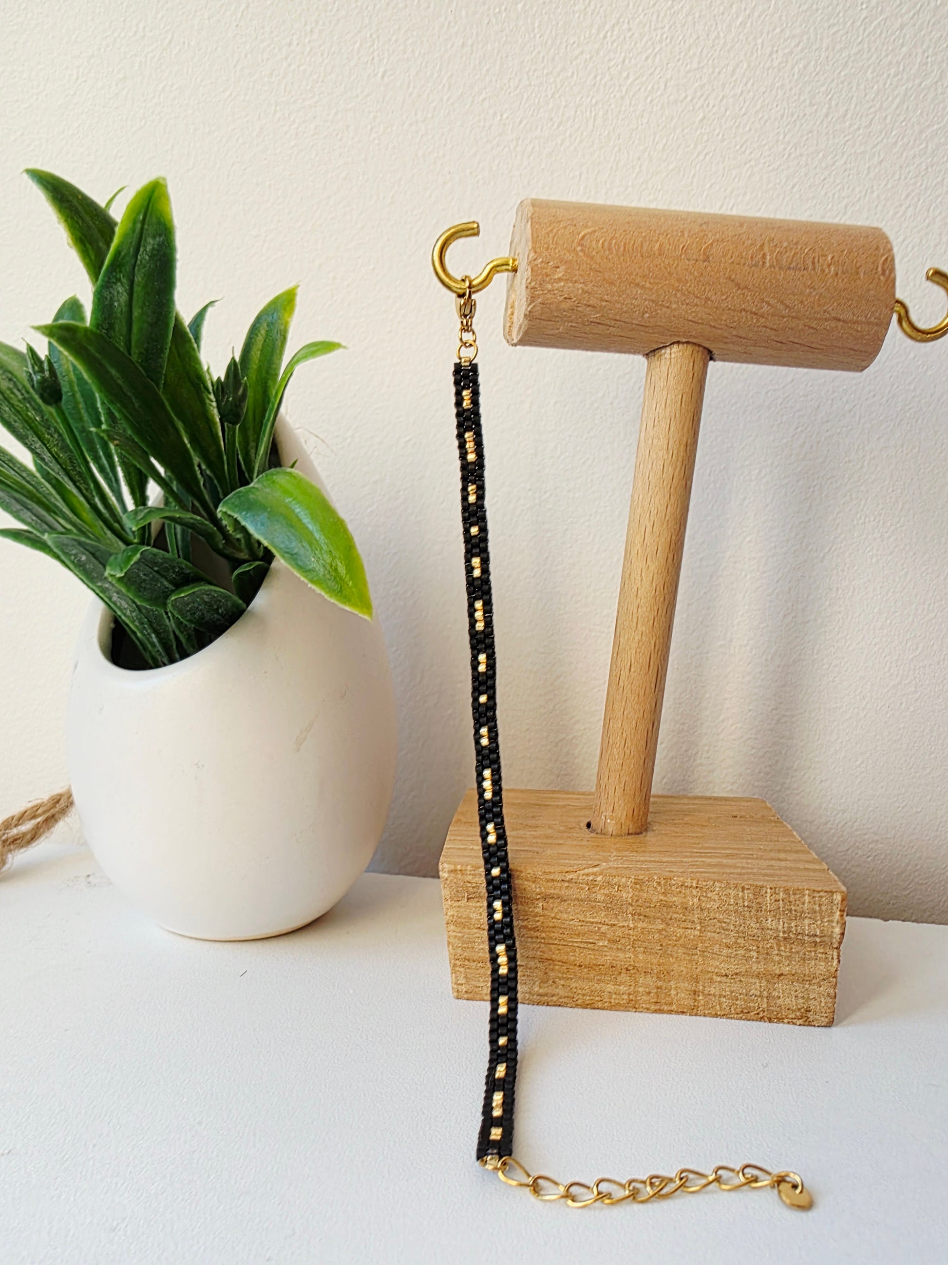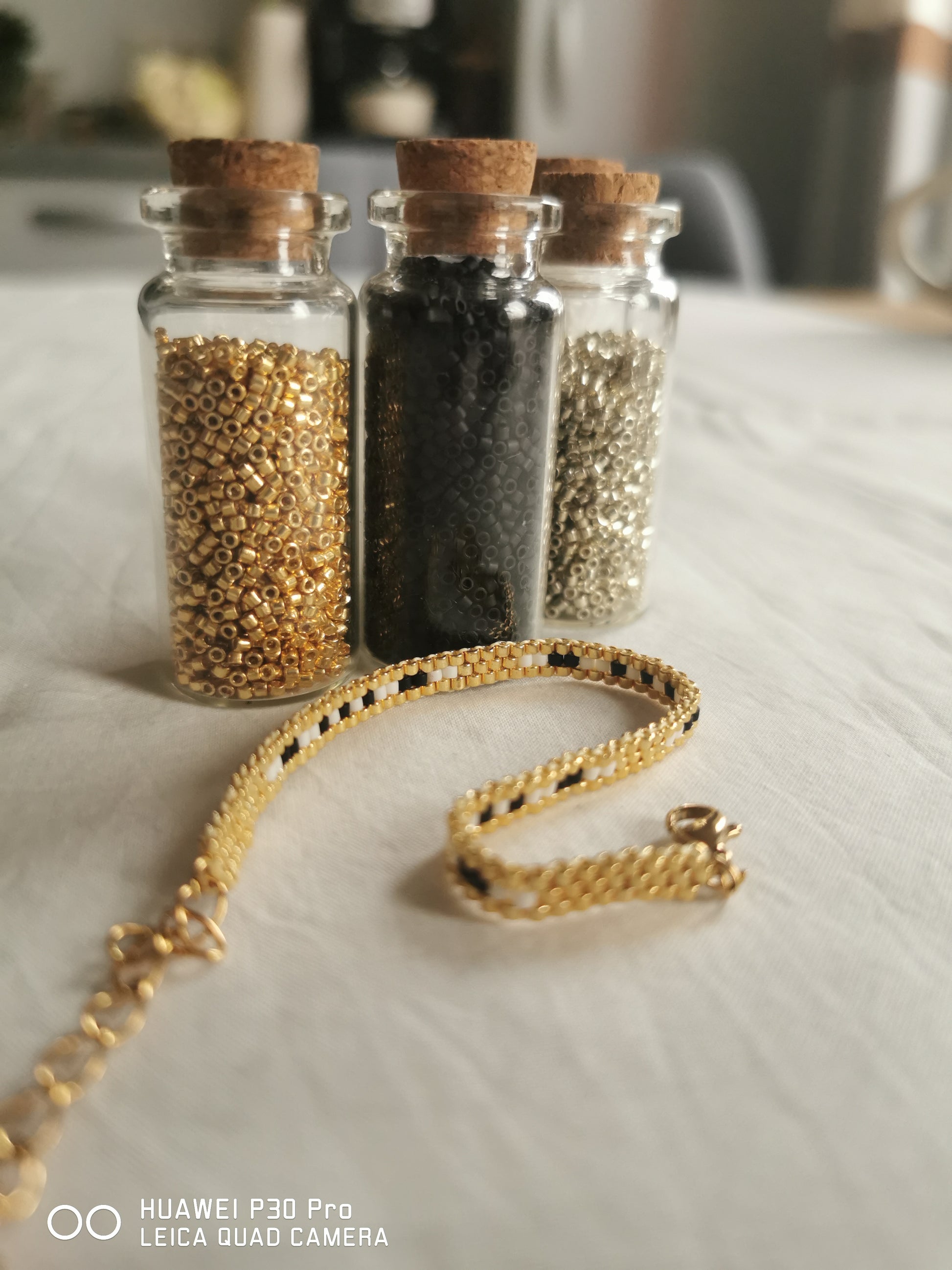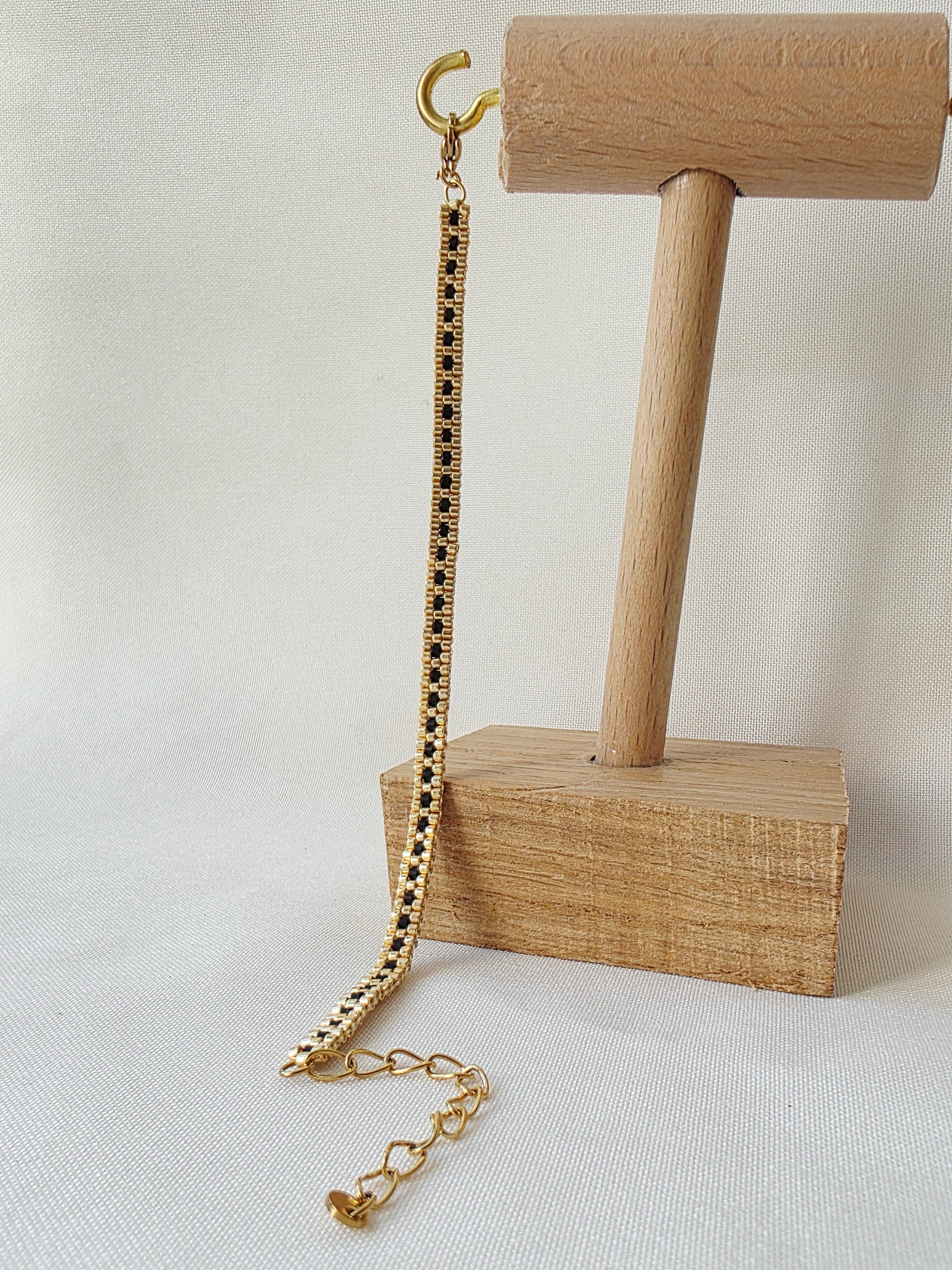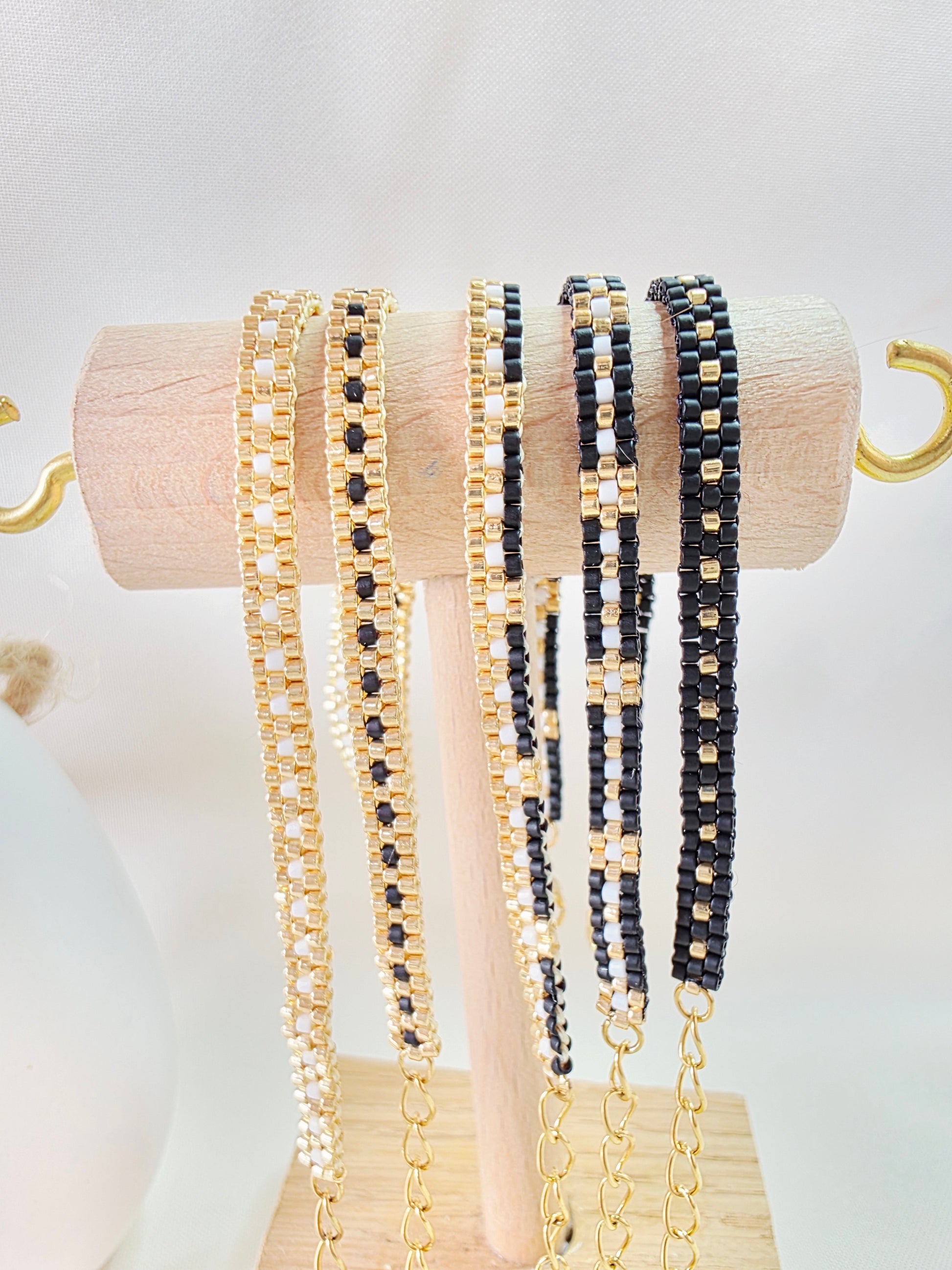 J’assemble chaque perle Miyuki Delica une à une pour créer un motif géométrique équilibré, où le doré vient illuminer les nuances mates et satinées du noir et du blanc.