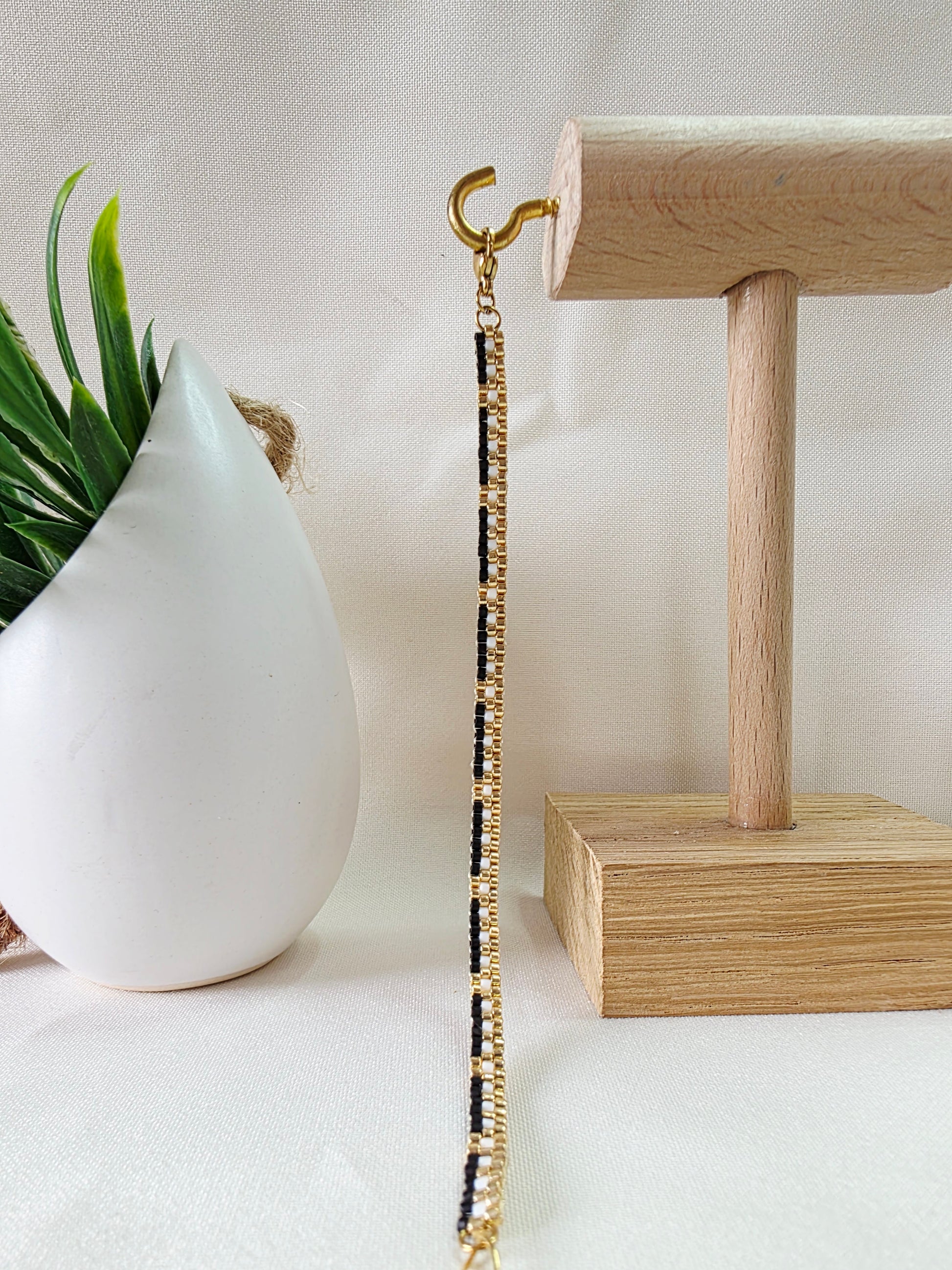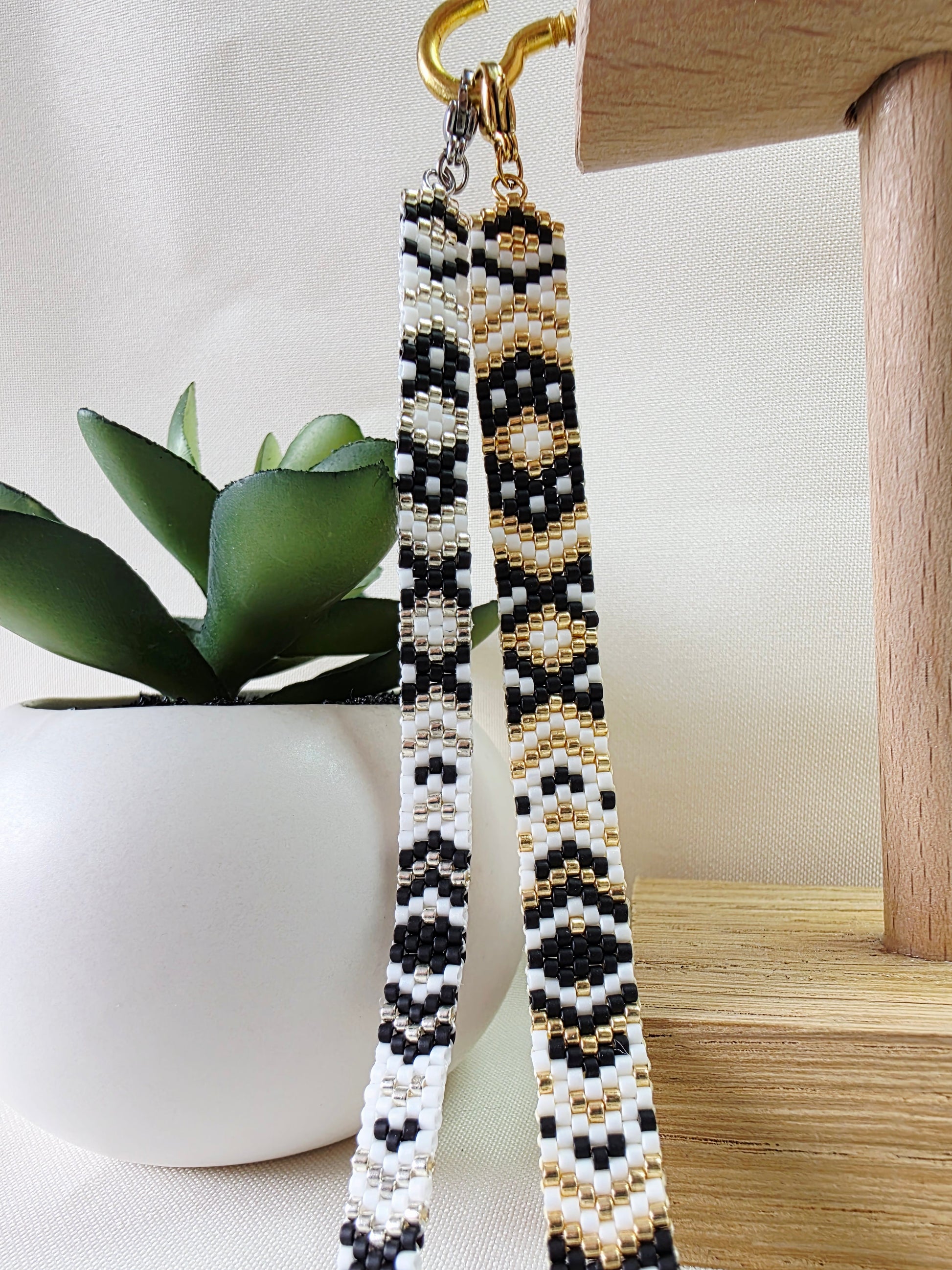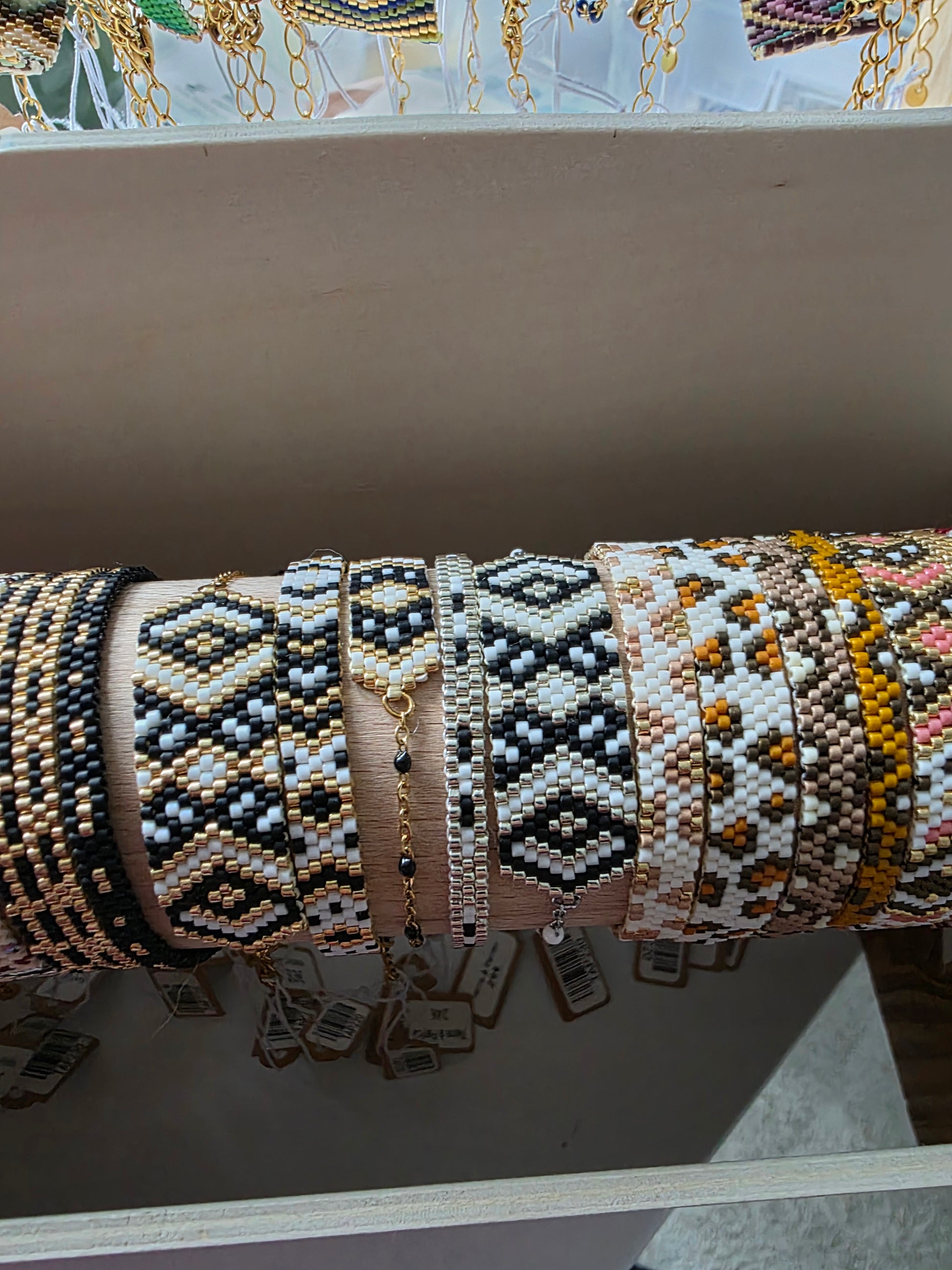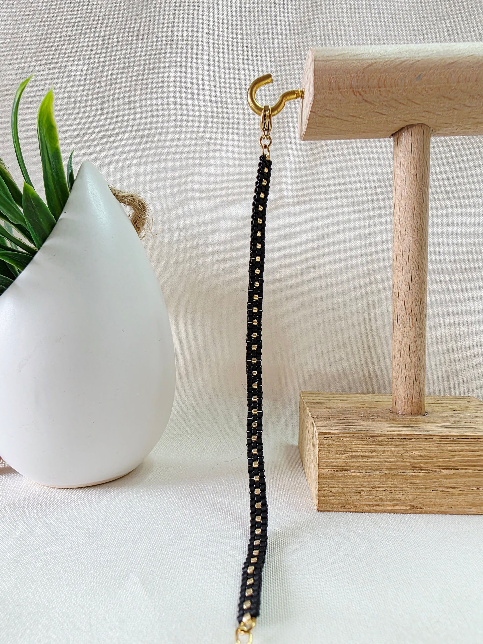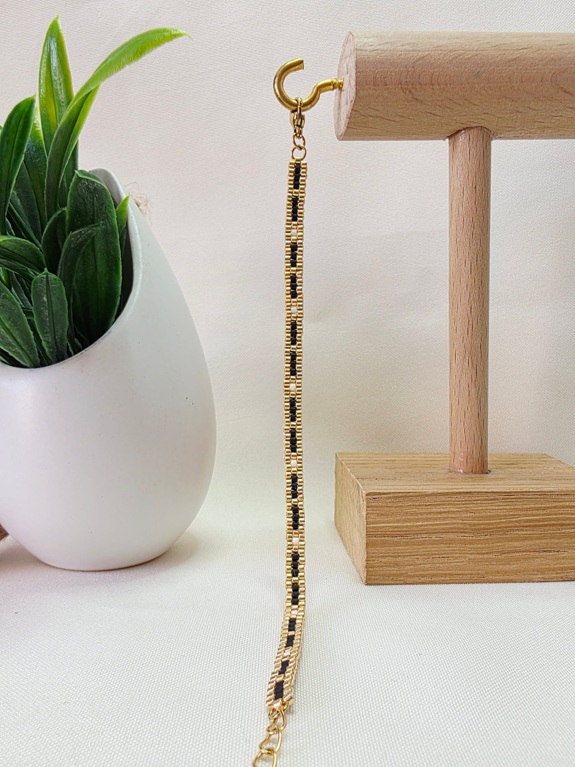 J’assemble chaque perle Miyuki Delica une à une pour créer un motif géométrique équilibré, où le doré vient illuminer les nuances mates et satinées du noir et du blanc.