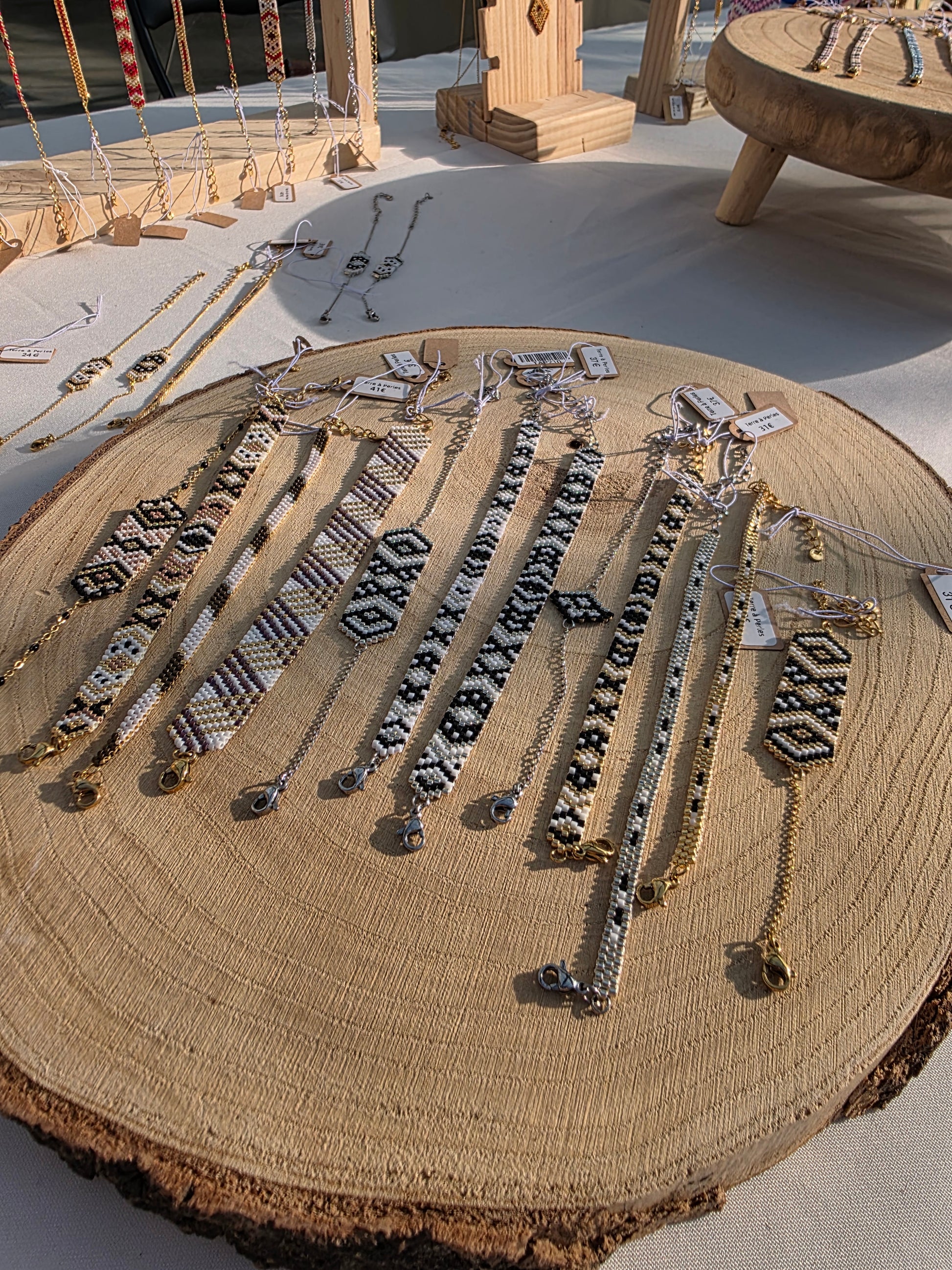 Chaque pièce est tissée à l’aiguille, perle après perle, avec soin et passion.
